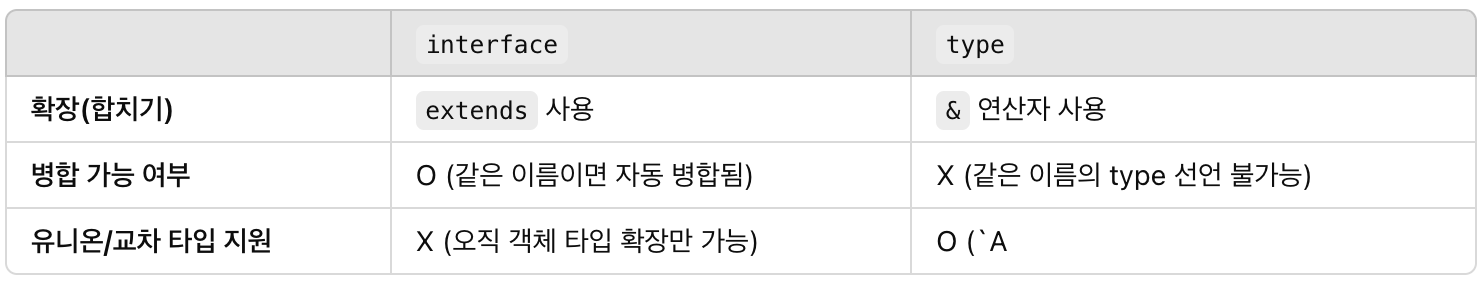 - interface๋ ์๋์ผ๋ก ๋ณํฉ(Declaration Merging) ๊ฐ๋ฅ