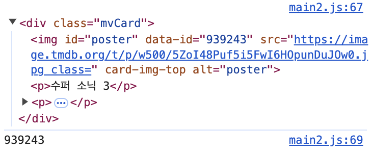"id"๋ฅผ ๋ฃ์ด๋ณด๋ poster๊ฐ ๋ด๋ค. ์ด๋ img ํ๊ทธ์ ์๋ id ๊ฐ์ ๊ฐ์ ธ์จ ๊ฒ์ด๋ค.