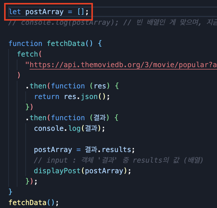 ๐ fetch ํจ์๋ก ๊ฐ์ ธ์จ ๊ฒฐ๊ณผ๋ฅผ ํจ์ ๋ฐ์์ ์ ์ญ ๋ณ์๋ก ์ ์ธํ๊ธฐ