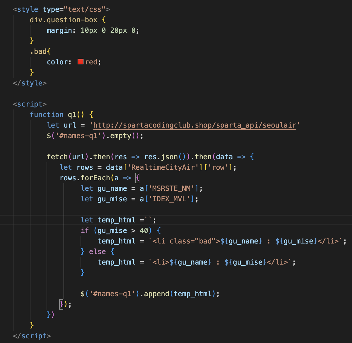 4. if함수 작성하기-> 미세먼지 값 > 40 이면 class = "bad"아니면 기존 형식