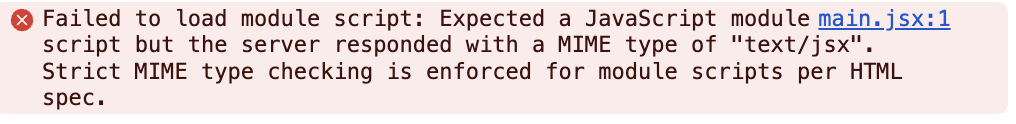 Failed to load module script: Expected a JavaScript module script but the server responded with a MIME type of "text/jsx". Strict MIME type checking is enforced for module scripts per HTML spec.