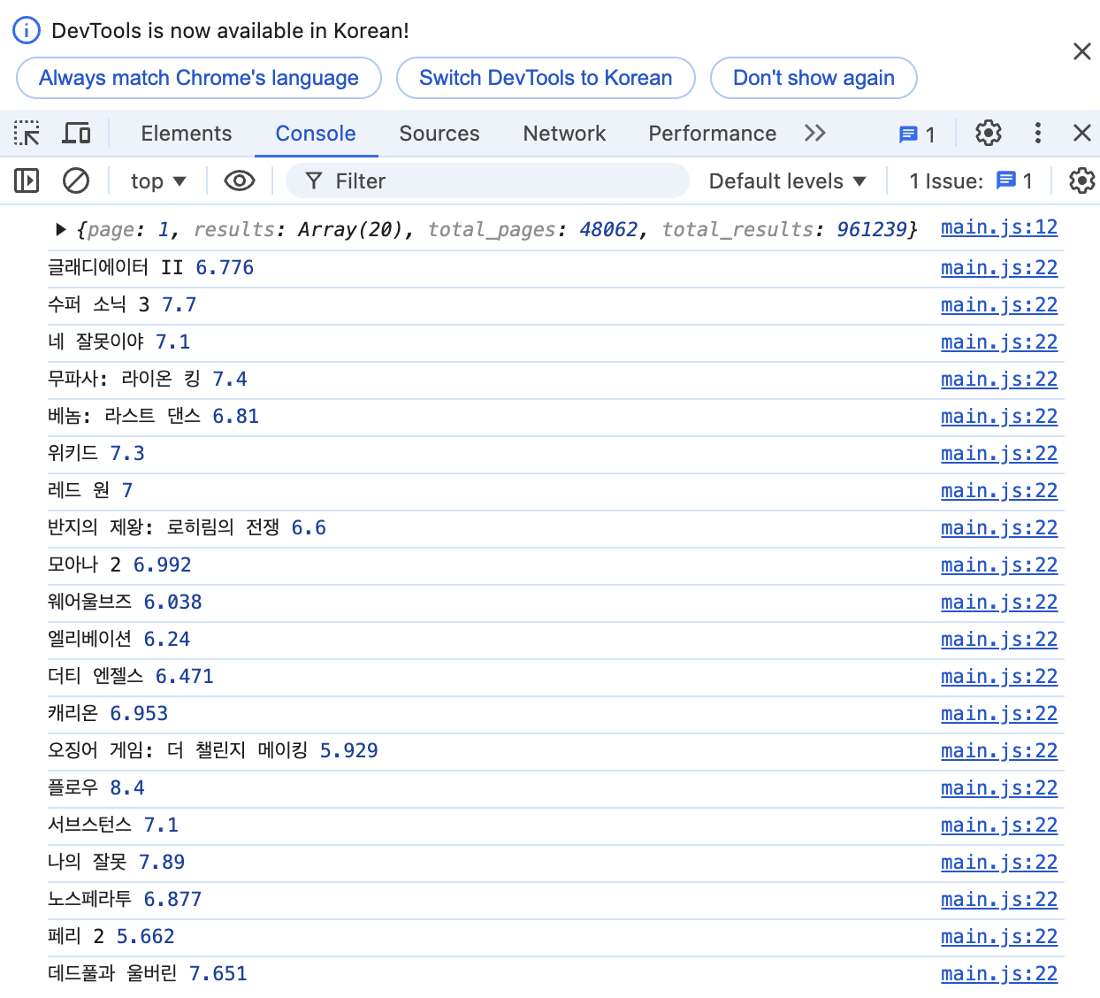 4. fetch์ ulr ๋ด์ en-US -> ko-KR๋ก ๋ณํ & api ํ๊ธํ